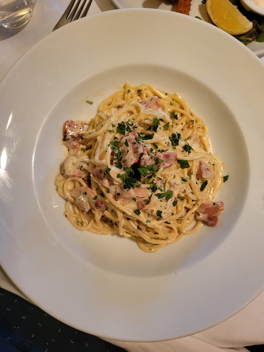 Carbonara: A creamy, rich pasta dish with crispy pancetta and parmesan.